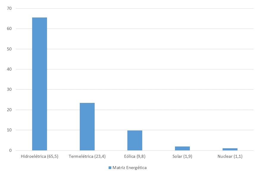 O Brasil possui mais de 9 mil usinas geradoras em operação, de acordo com a ANEEL referente a dados de novembro de 2020. Todos esses ativos somados tem uma capacidade instalada de 174,7 GW geração de energia elétrica, sendo predominantemente por intermédio das usinas hidrelétricas. Confira no gráfico abaixo a participação de cada matriz energética, segundo anuário da Empresa de Pesquisa Energética de 2021, relativo a dados de 2020: